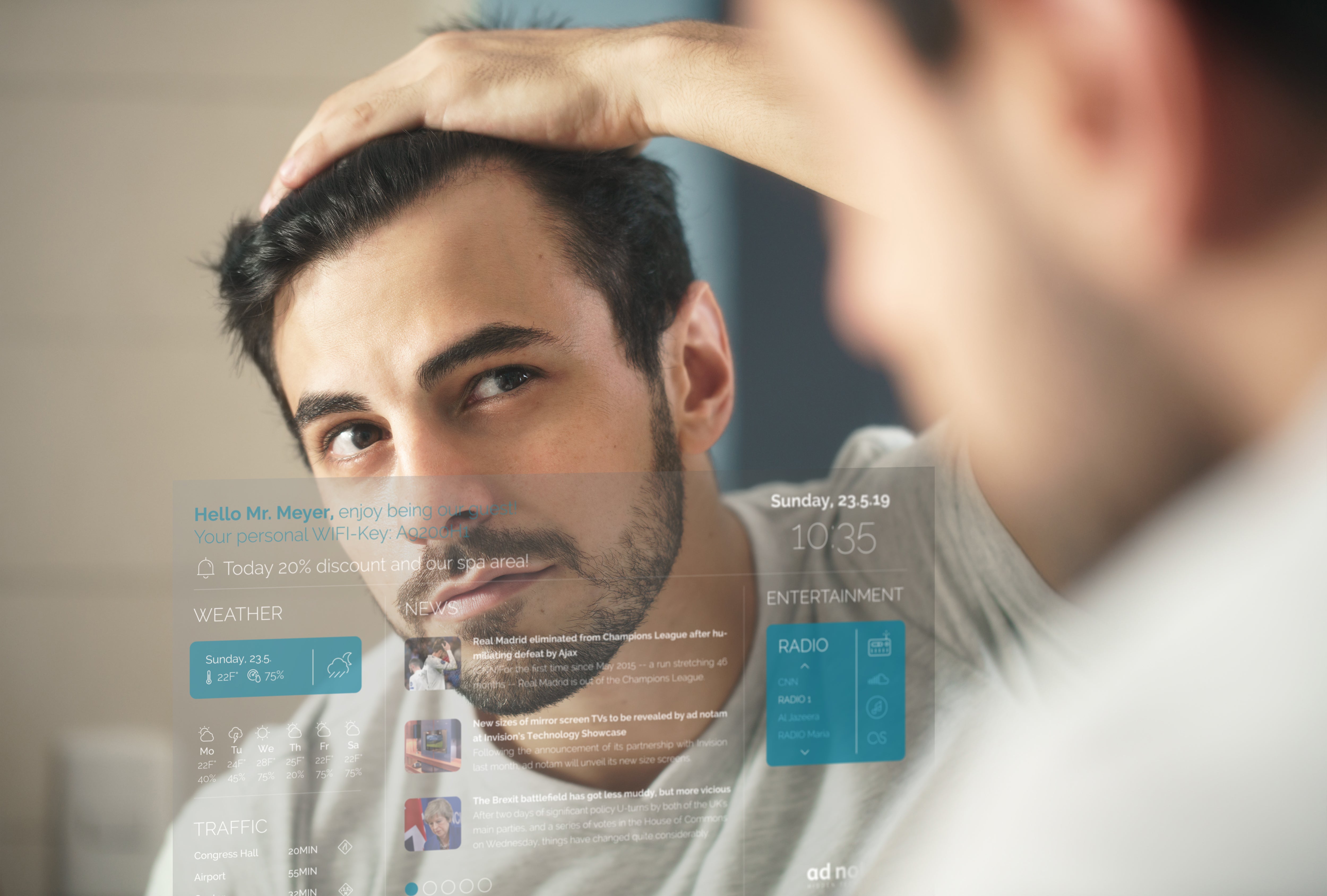Mit Magic Mirror liefert ad notam im eingeschalteten Zustand Bildqualität auf höchstem Niveau, während im ausgeschalteten Zustand der Bildschirmbereich vollständig hinter einer homogenen Spiegelfläche verschwindet und Ihr Smart Mirror zu einem eleganten Einrichtungsgegenstand in Ihrer Umgebung wird.