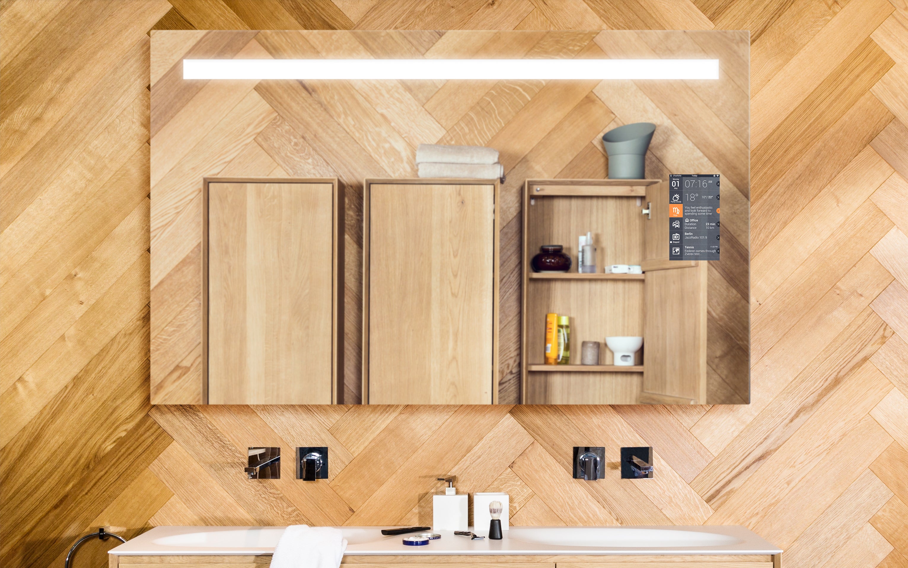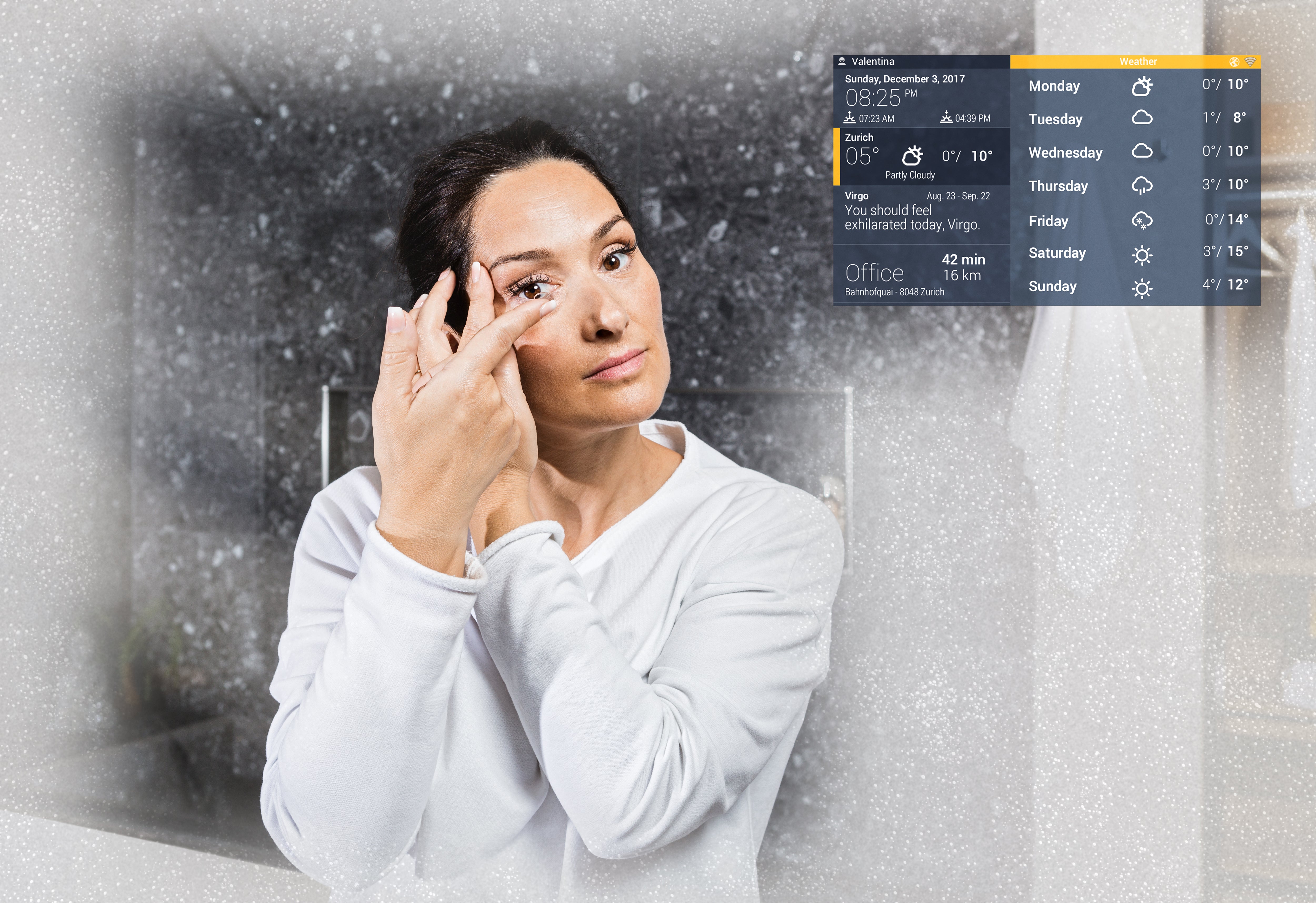 Ein Spiegel, der nicht einfach Sie und den Raum widerspiegelt, in dem Sie sich befinden. Er zeigt Sie im besten Licht. Er lässt Sie hören, was Sie hören möchten. Und er gibt Ihnen alle Informationen für den Tag, damit Sie auf alles vorbereitet sind. Besser können Sie morgens nicht in den Tag starten. Besser können Sie ihn abends nicht beschließen.