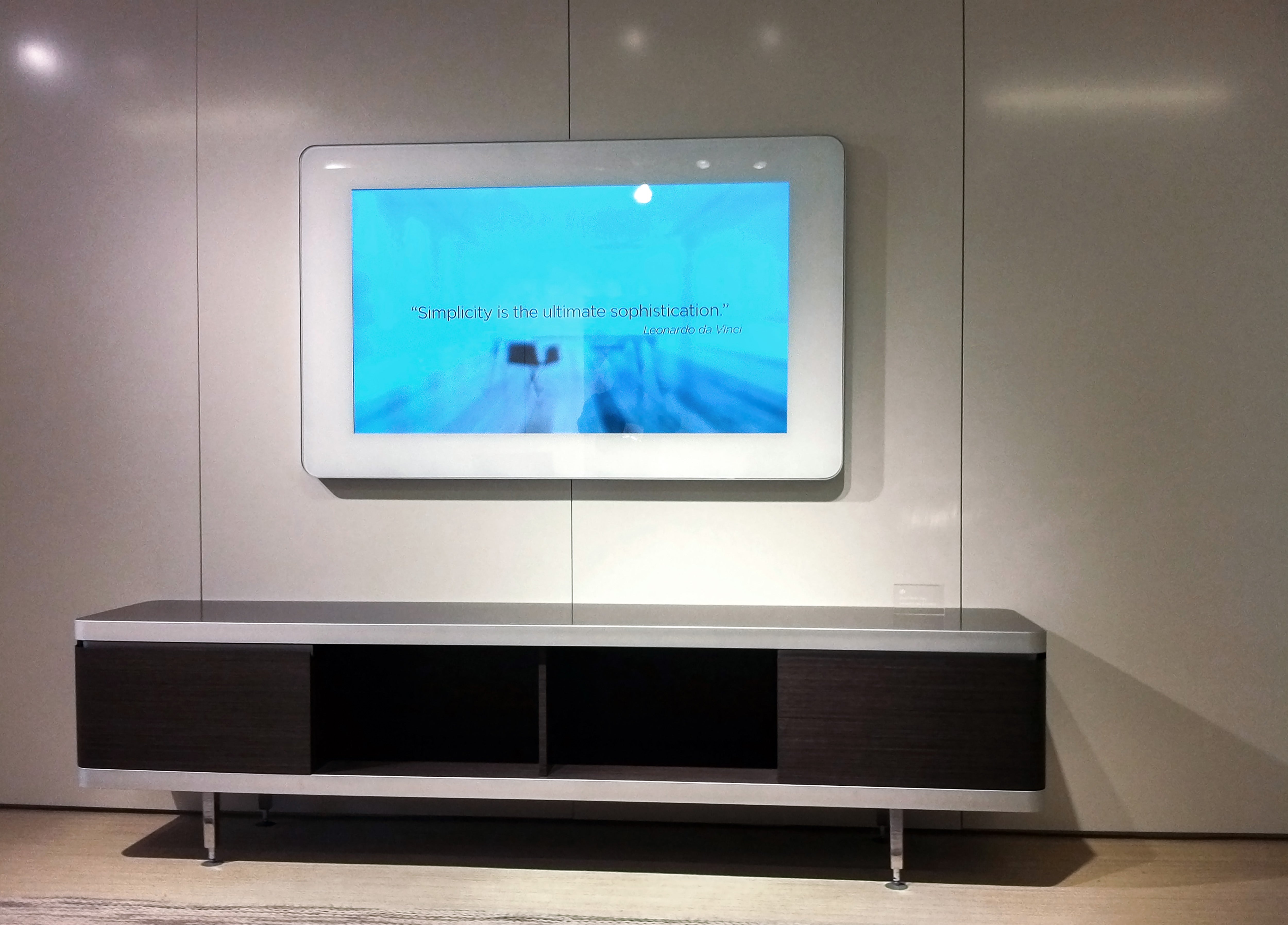 ad notam ist ein elegantes und kraftvolles Kommunikationswerkzeug, das den Betrachter in seinen Bann zieht. Der Monitor wird gut geschützt hinter Glas- oder Spiegelflächen angebracht und stellt Ihre Werbe- und Firmenbotschaft auf exklusive, anspruchsvolle Weise in den Mittelpunkt.