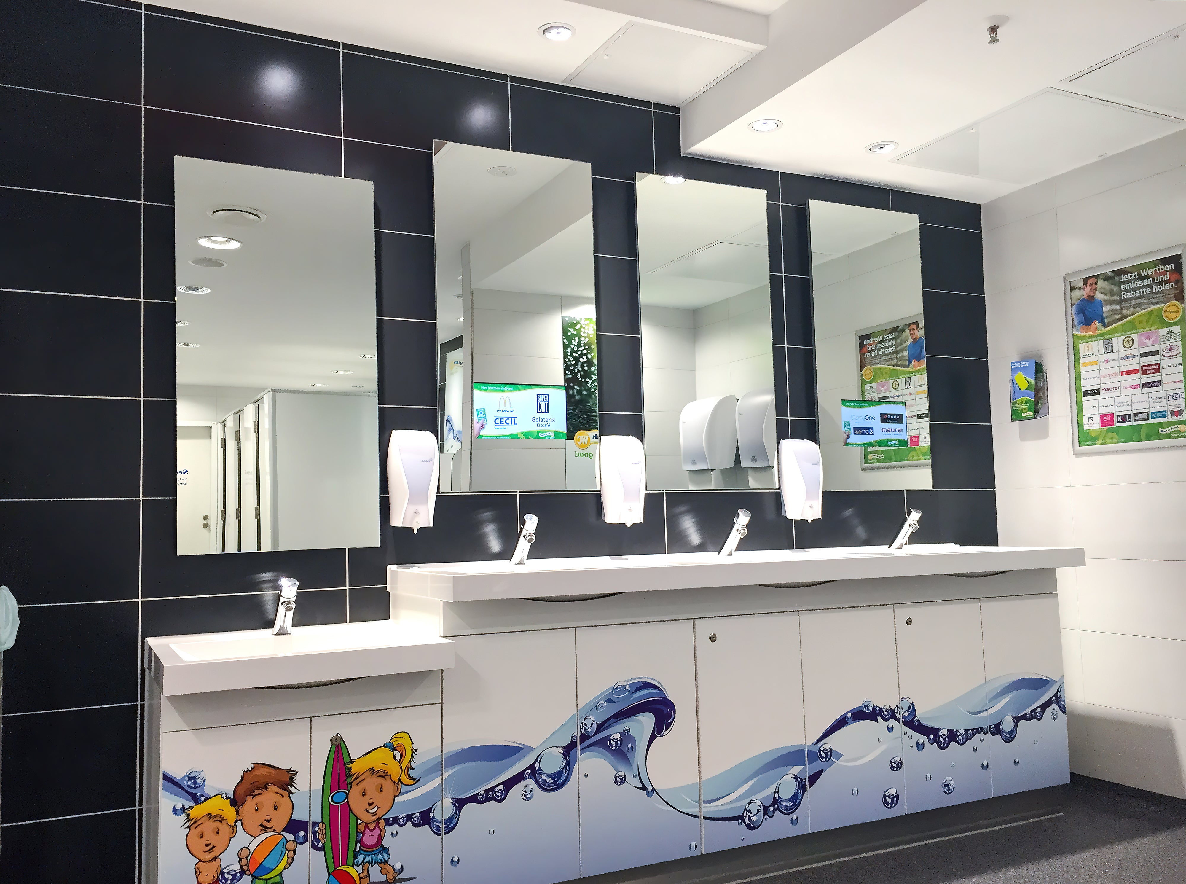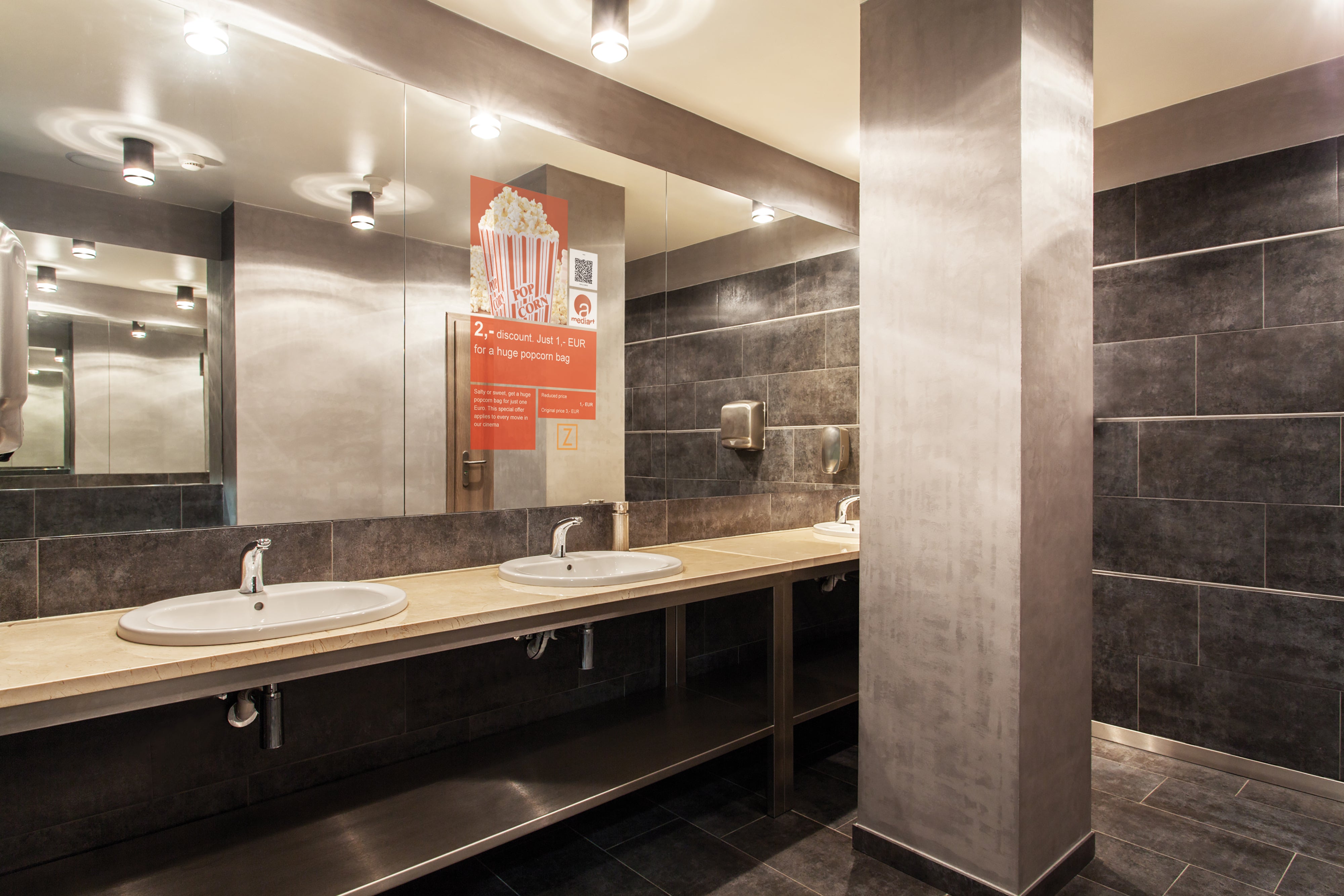 Das ist das Schöne an ad notam-Anwendungen in öffentlichen WCs - Werbung kann durch unsere sogenannte CMS-Software ferngesteuert und über einen zentralen Server innerhalb eines Monitors platziert werden. Es ist unmöglich sie zu übersehen.